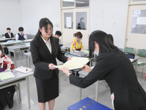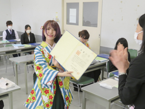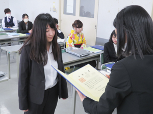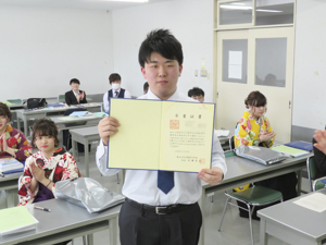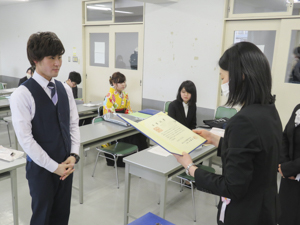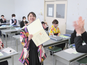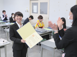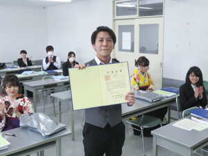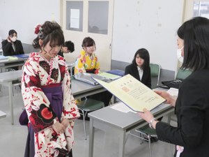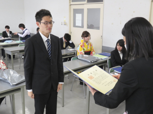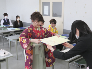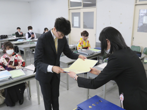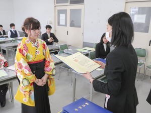 社会福祉科の卒業式は、まず最初に卒業ビデオ制作委員会が制作した映像を鑑賞しました。映像の一コマ一コマは、つい昨日のことのように鮮明に蘇り卒業式の雰囲気を演出してくれました。その後、一人一人に担任から卒業証書の配布が行われました。