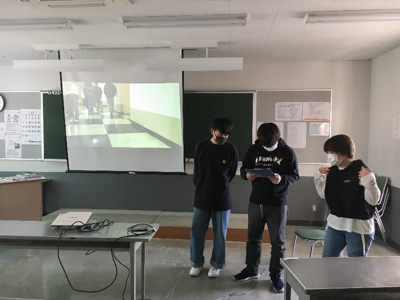 後半は、グループごとに発表を行い、車いすの目線で動画を紹介する者、計算したスロープの勾配、アイマスクの不安などを発表しました。