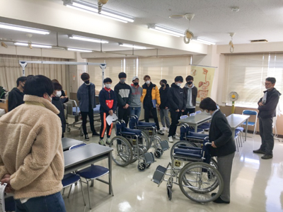 さらに、車いすの利用方法、白杖の取り扱いについて介護福祉科の相澤先生より説明を受けました。
