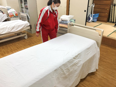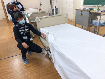 先ずは、シーツを置くところ、拡げるところから(写真左が岩手県出身。写真右は宮城県出身。たまたま、高校時代の運動着が一緒( ??` )。こんなこともあるのですね。早くおそろいの実習着が届くといいですね)。