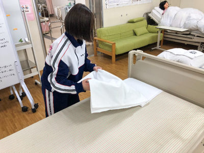 生活支援技術Ⅰの授業も3回目。段階的に演習に入っていきます。本日の授業は「ベッドメイキング」。利用者さんに上質な眠りを提供できるよう、介護福祉士は休息?睡眠の環境を整えます。