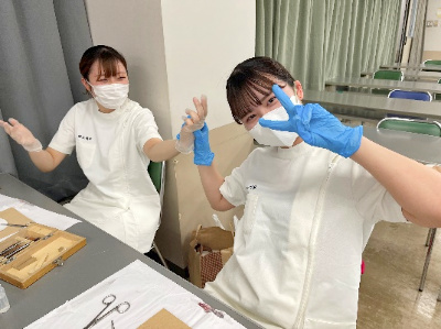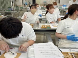 視能訓練士科1年生は、解剖生理学の授業で豚の眼を解剖し、構造を触りながら学びました。
