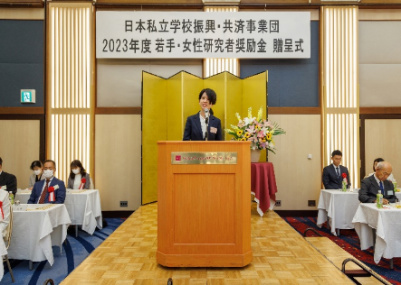 式では、女性研究者奨励金の受賞者を代表し、山﨑真帆助教が、日本私立学校振興?共済事業団の福原紀彦理事長から贈呈書を授与されるとともに、受賞者挨拶を行いました。
