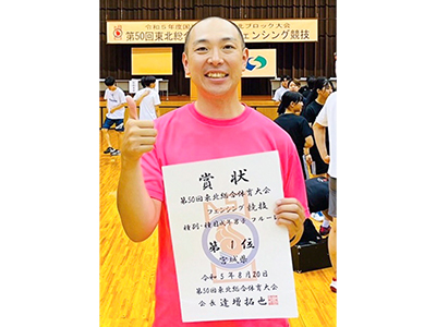 本学フェンシング部からは齋藤有監督が選手を兼ねて参加し、宮城県代表成年男子フルーレ(団体戦)で全勝優勝しました。
