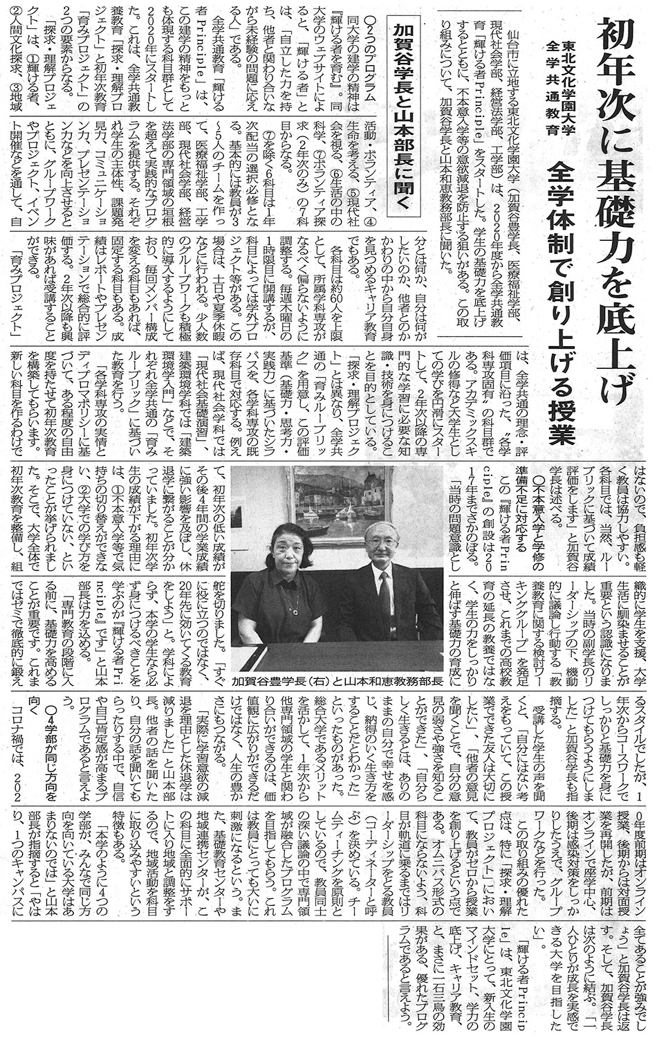 教育学術新聞「初年次に基礎力を底上げ 全学体制で創り上げる授業」で、加賀谷学長と山本教務部長のインタビュー記事が掲載されました。