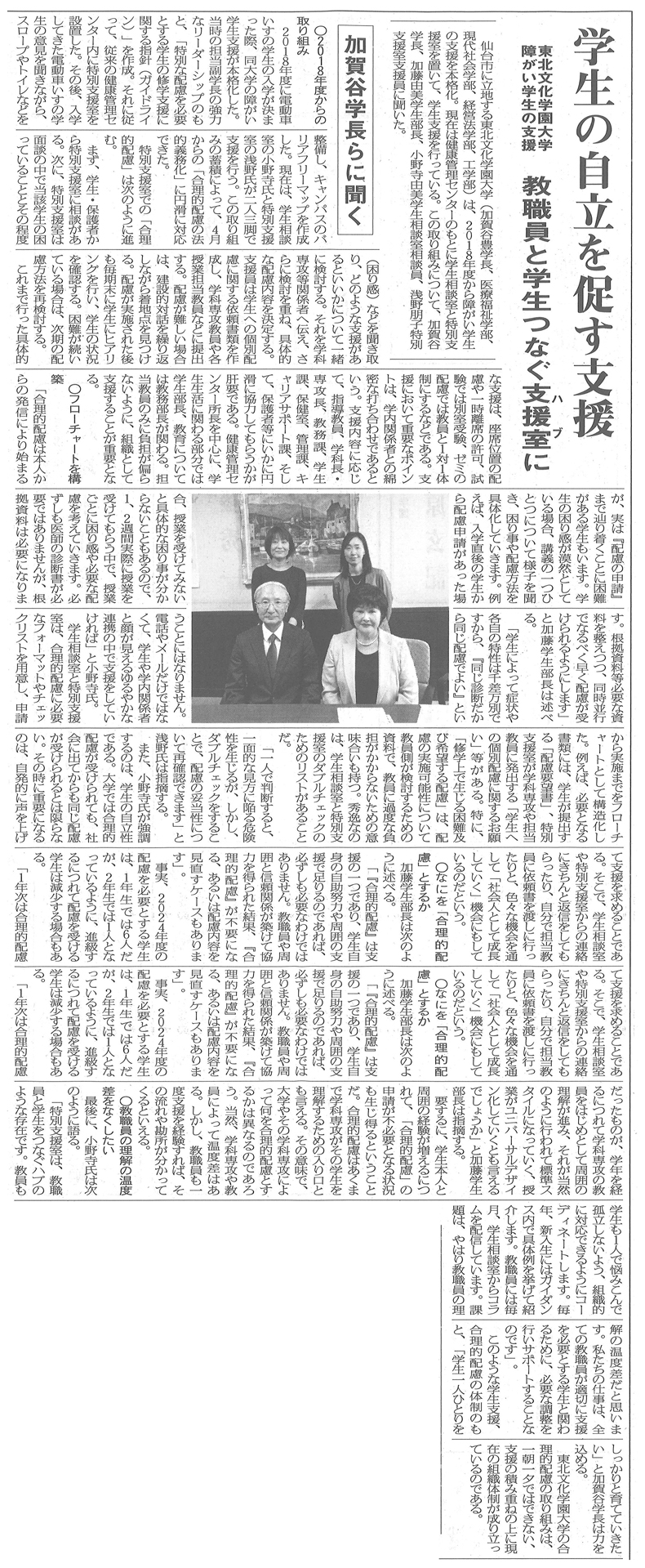 教育学術新聞「学生の自立を促す支援 東北文化学園大学障がい学生の支援 教職員と学生をつなぐ支援室に」の記事中で、加賀谷学長、加藤由美学生部長、小野寺由美学生相談室相談員と浅野朋子特別支援室支援員とのインタビュー記事が掲載されました。